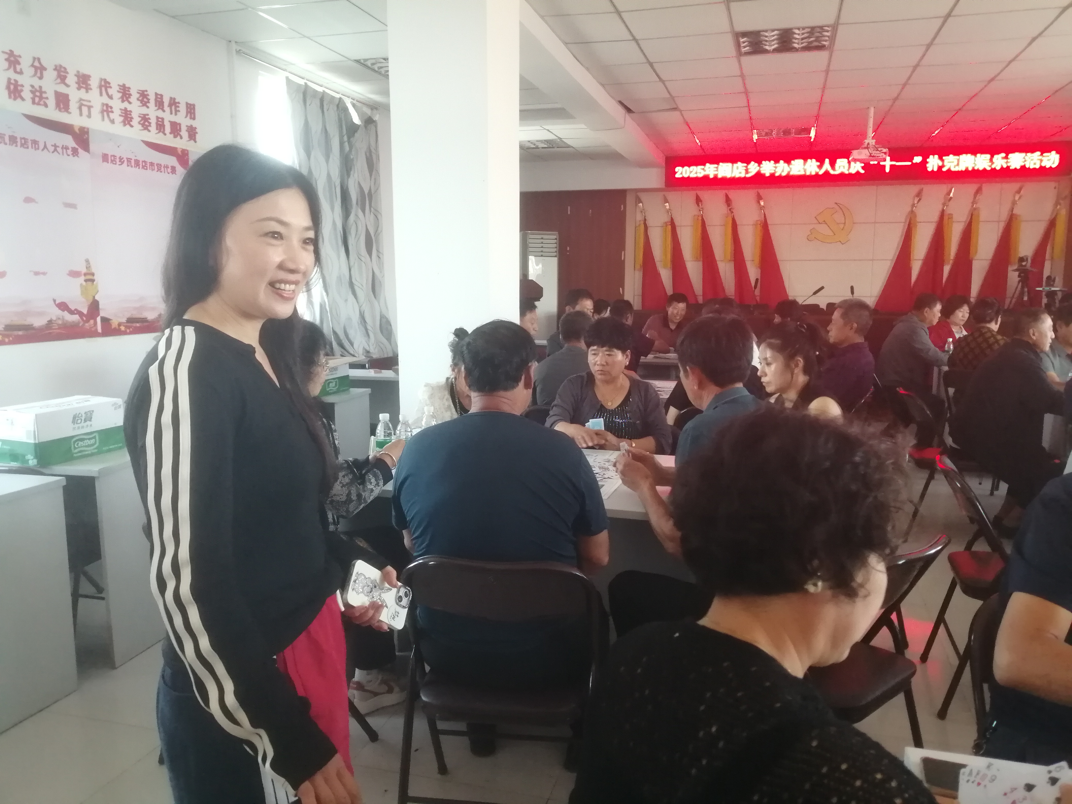 为丰富辖区退休人员精神文化生活,营造欢乐祥和的国庆氛围,在阎店乡党委政府和社保中心的大力支持下,阎店乡劳动保障所于“十一”国庆节来临之际,精心组织扑克牌娱乐活动。近50名退休人员欢聚一堂,以牌会友,共庆佳节。
