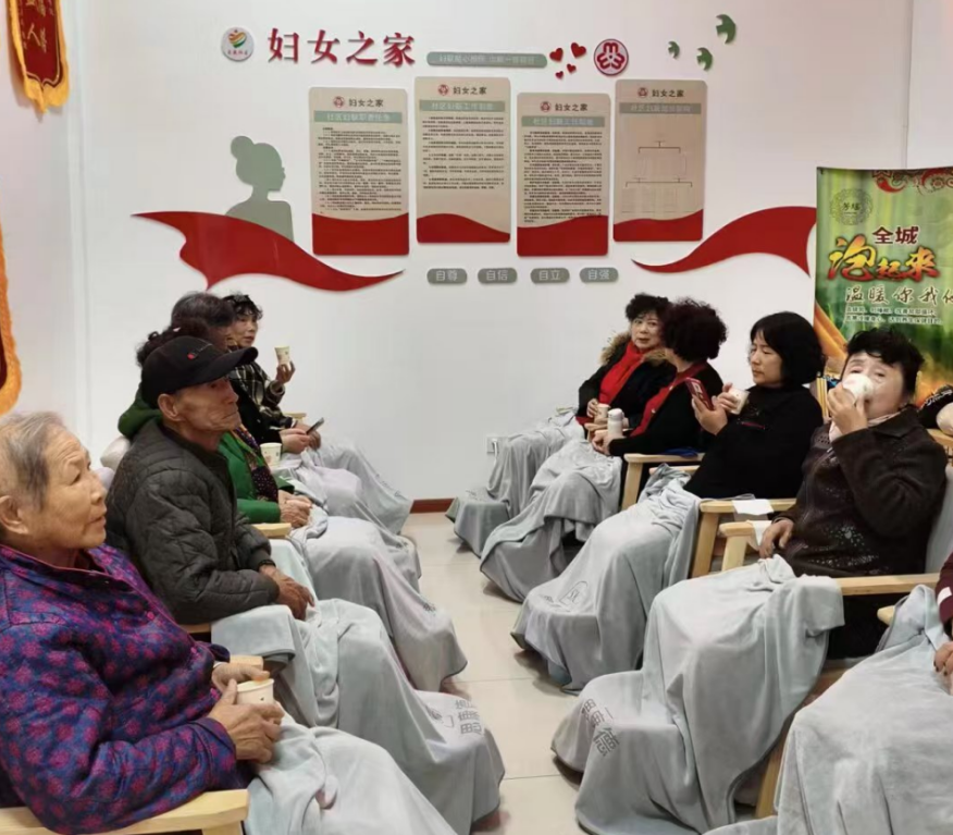 活动在社区各活动室温馨而有序开展着。妇女之家活动室内思康德养生会所的工作人员一边通过AI健康检查设备快速为居民完成中医体质辨识、脏腑功能评估,几分钟内便生成包含体质类型、健康风险等内容的个性化健康报告,让居民直观了解自身健康状况。另一边,在清新的草药味中,老人们一边用中药泡脚,一边和邻里聊着家常,让他们在家门口就能享受到舒适便捷的服务。