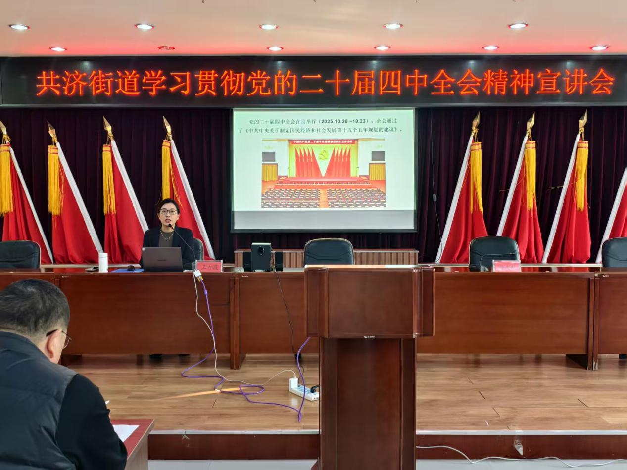 近日,共济街道召开学习贯彻党的二十届四中全会精神宣讲会,特别邀请市委宣讲团成员、市委党校副校长王力薇作专题宣讲。共济街道党工委班子成员、机关干部、社区工作人员共计60余人参加宣讲会。