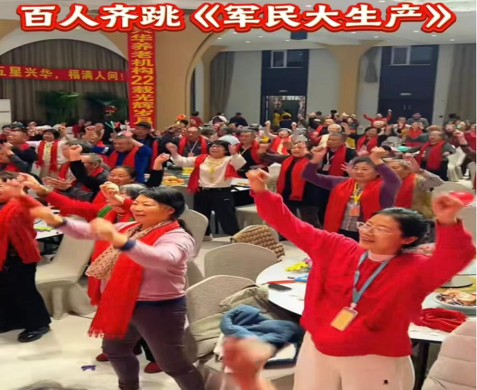 活动伊始,便是充满激情与活力的舞会时光。伴随着欢快的音乐节奏,百人身着色彩鲜艳的服装,脸上洋溢着灿烂的笑容,纷纷走进舞池,齐跳《军民大生产》。尽管岁月在他们的脸上留下了痕迹,但此刻,他们仿佛回到了青春岁月,脚步轻盈,舞姿翩翩。有的老人两两结伴,默契配合,跳起了优雅的交谊舞;有的老人则独自随着音乐自由摇摆,尽情释放着内心的喜悦。现场气氛热烈非凡,欢声笑语回荡在每一个角落。工作人员也积极参与其中,与老人们手拉手共舞,拉近了彼此之间的距离,让老人们感受到了浓浓的关爱与温暖。