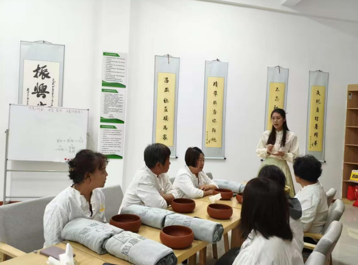 在实操体验环节,老师逐一示范茶熏操作流程,耐心指导居民调整姿势、控制呼吸,感受茶香氤氲带来的放松体验。居民们围坐在一起,静心体验茶熏养生,在淡雅的茶香中舒缓压力、放松身心,彼此交流养生心得,现场氛围轻松又温馨。